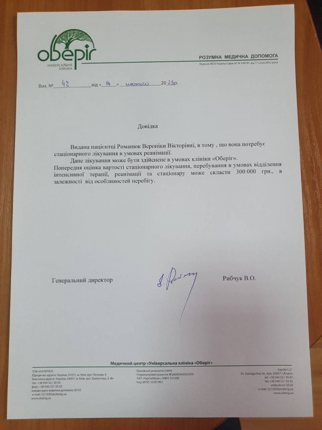 Багатопрофільна клініка «Оберіг», що в Києві, погодилася зробити операцію безплатно, однак на підготовку хворої та донора до операції, а також на післяопераційну реабілітацію необхідні значні кошти.