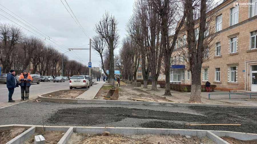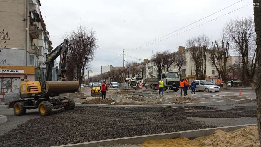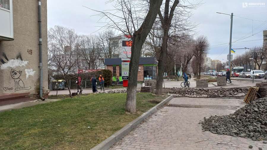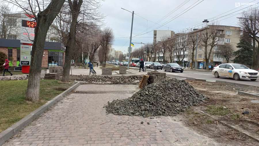 Цього тижня тут облаштовують тротуари, роблять основу під бруківку. Бруківкою викладатимуть заїзди у двори та велодоріжку.