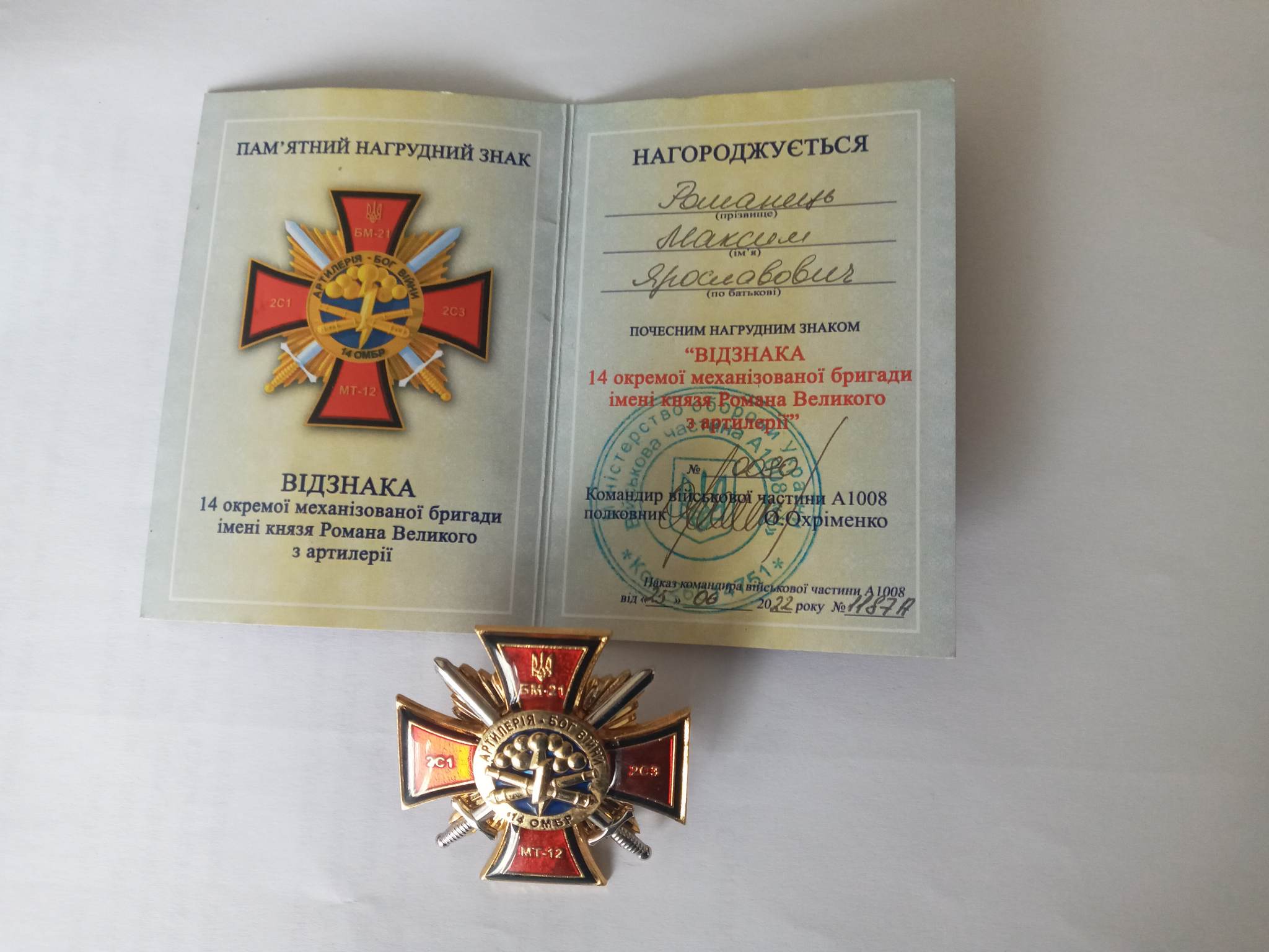 почесний нагрудний знак «Відзнака 14 окремої механізованої бригади ім. князя Романа Великого з артилерії» від командира в/ч А1008.