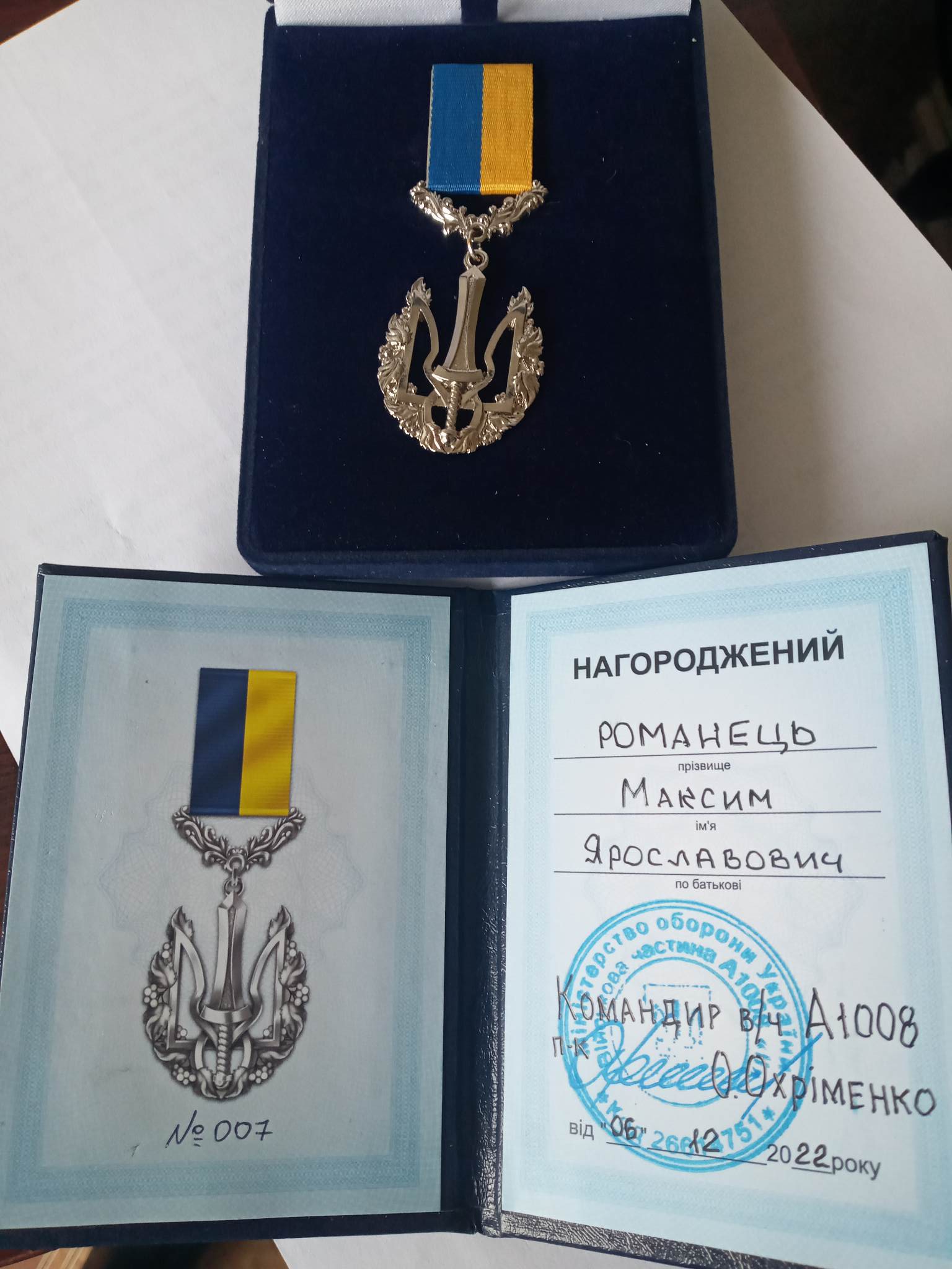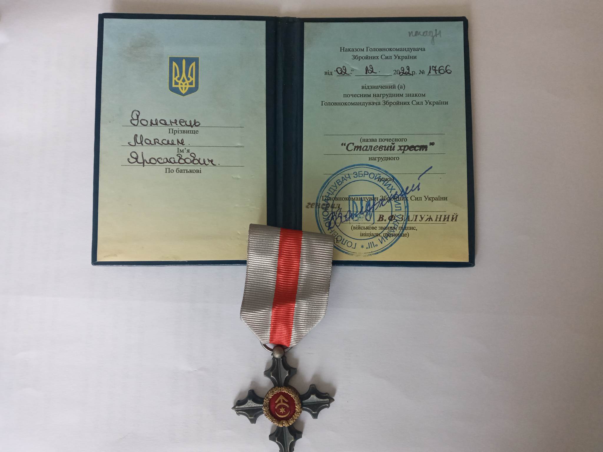 нагрудний знак «Сталевий хрест» від головнокомандувача Збройних сил України Валерія Залужного;