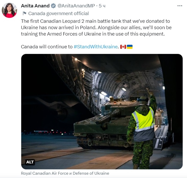 «Перший канадський основний бойовий танк Leopard 2, який ми безоплатно передали Україні, прибув до Польщі. Разом із нашими союзниками ми найближчим часом будемо навчати Збройні сили України користуванню цією технікою», – написала Ананд.