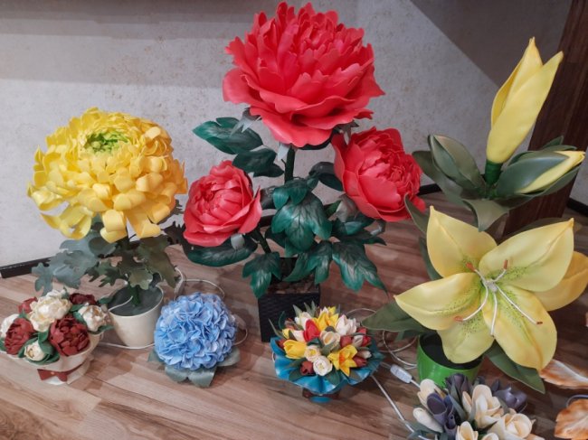 Пізніше були лілія, хризантема, півонія, магнолія, тюльпани, гортензії і навіть лялька. Такі квіткові композиції приносять естетичне задоволення, а у вечірній час деякі з них освітлюють кімнату. У цьому, розповідає жінка, їй допомагає син, який опановує професію електрика.