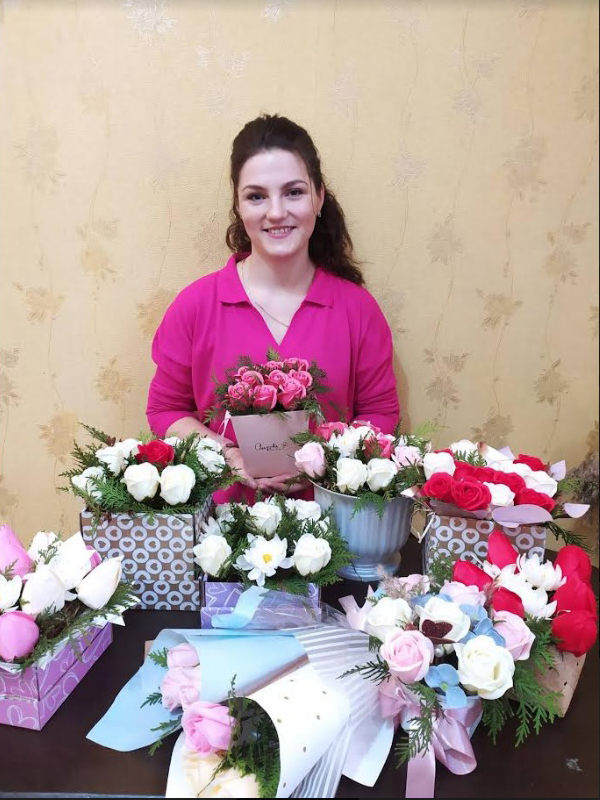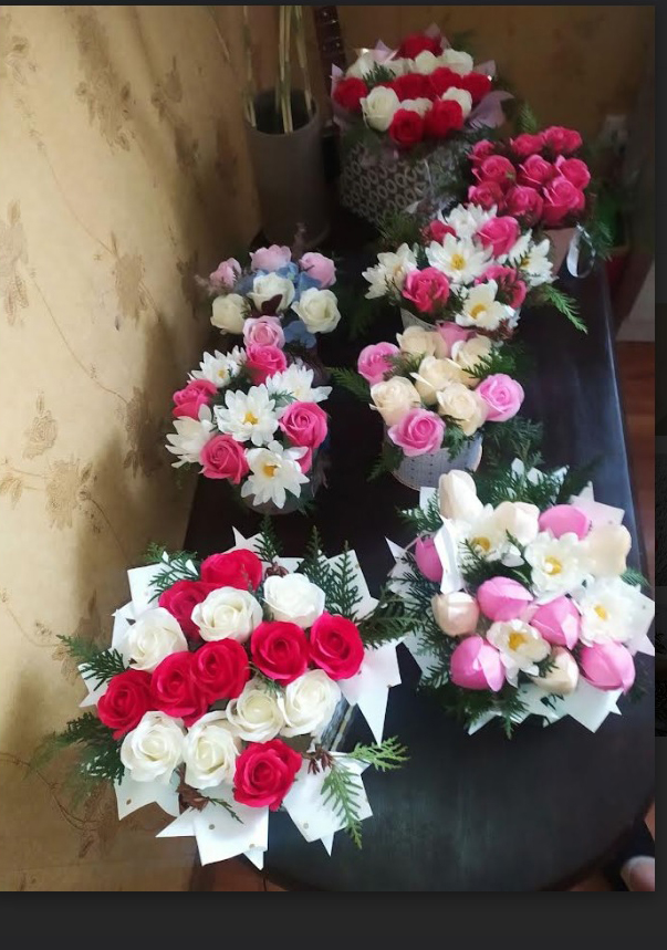 Зараз у доробку майстрині понад 300 мильних квіткових композицій. Їх вартість стартує від 100 гривень. Клієнт може зробити індивідуальне замовлення під конкретну подію у певній кольоровій гамі. Хоча створює Олена Кузьмич і їстівні букети – може скомпонувати естетичний витвір як із солодощів, так і з сирків із ковбасами.