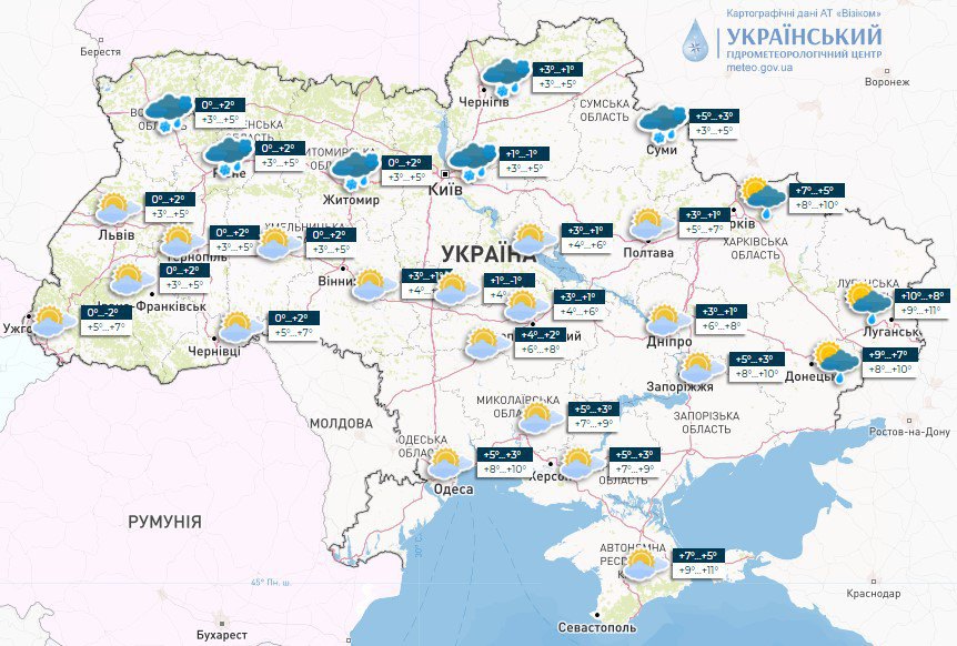 Вночі в Україні дощ та мокрий сніг; вдень у східній частині невеликий дощ, у північних областях місцями невеликий мокрий сніг, на решті території без опадів.