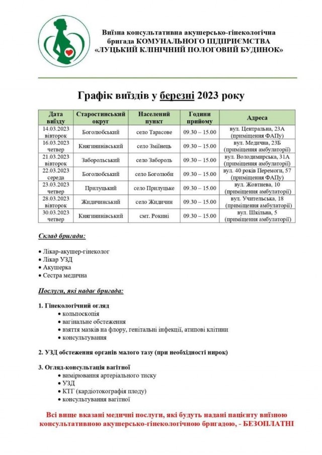 У селах Луцької громади з 14 по 30 березня безоплатно діятиме виїзна консультативна акушерсько-гінекологічна бригада. Вона створена на базі поліклінічного відділення Луцького клінічного пологового будинку.
