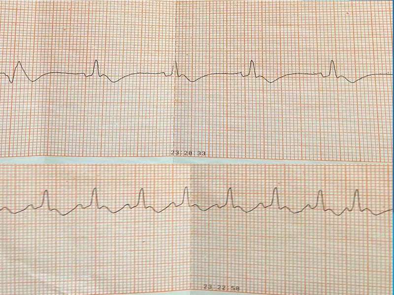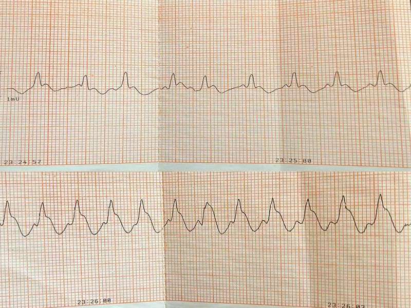 Після відновлення кровообігу, на моніторі дефібрилятора зафіксовано шлуночкову тахікардію з широкими комплексами, з пульсом на магістральних судинах.