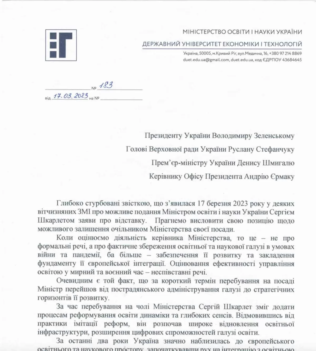 Із закликом не звільняти Сергія Шкарлета, серед інших, звернувся колектив Державного університету економіки і технологій.