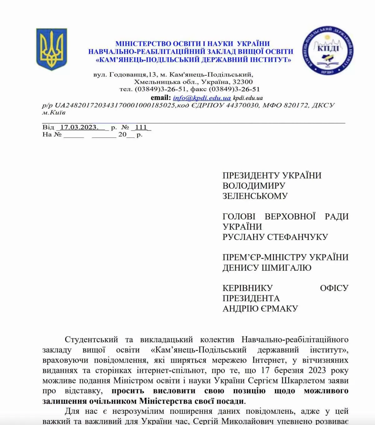 Підтримку Сергію Шкарлету висловив "Кам’янець-Подільський державний інститут".