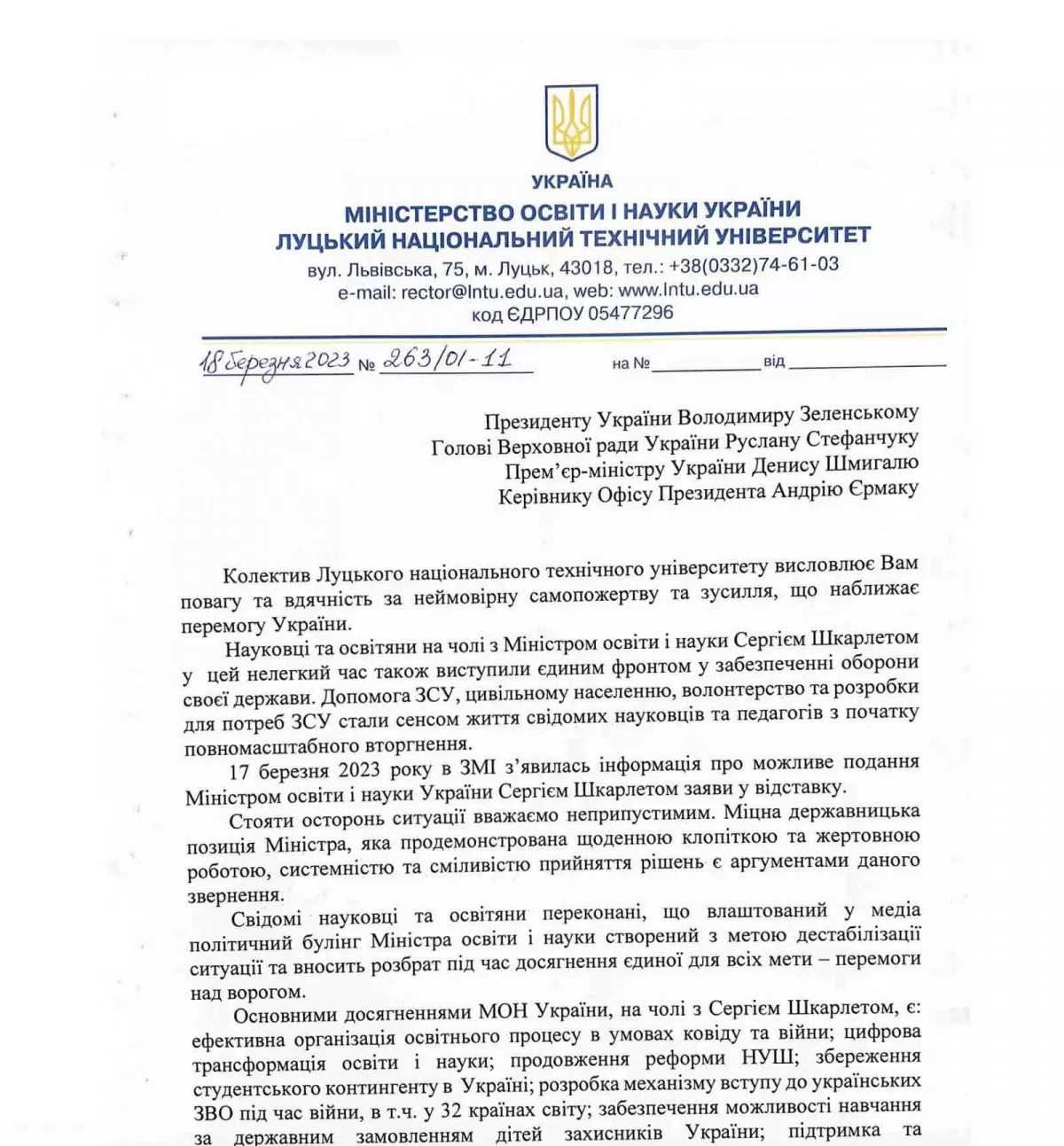 Підтримав Сергія Шкарлета і колектив Луцького національного технічного університету на чолі з ректоркою Іриною Вахович.