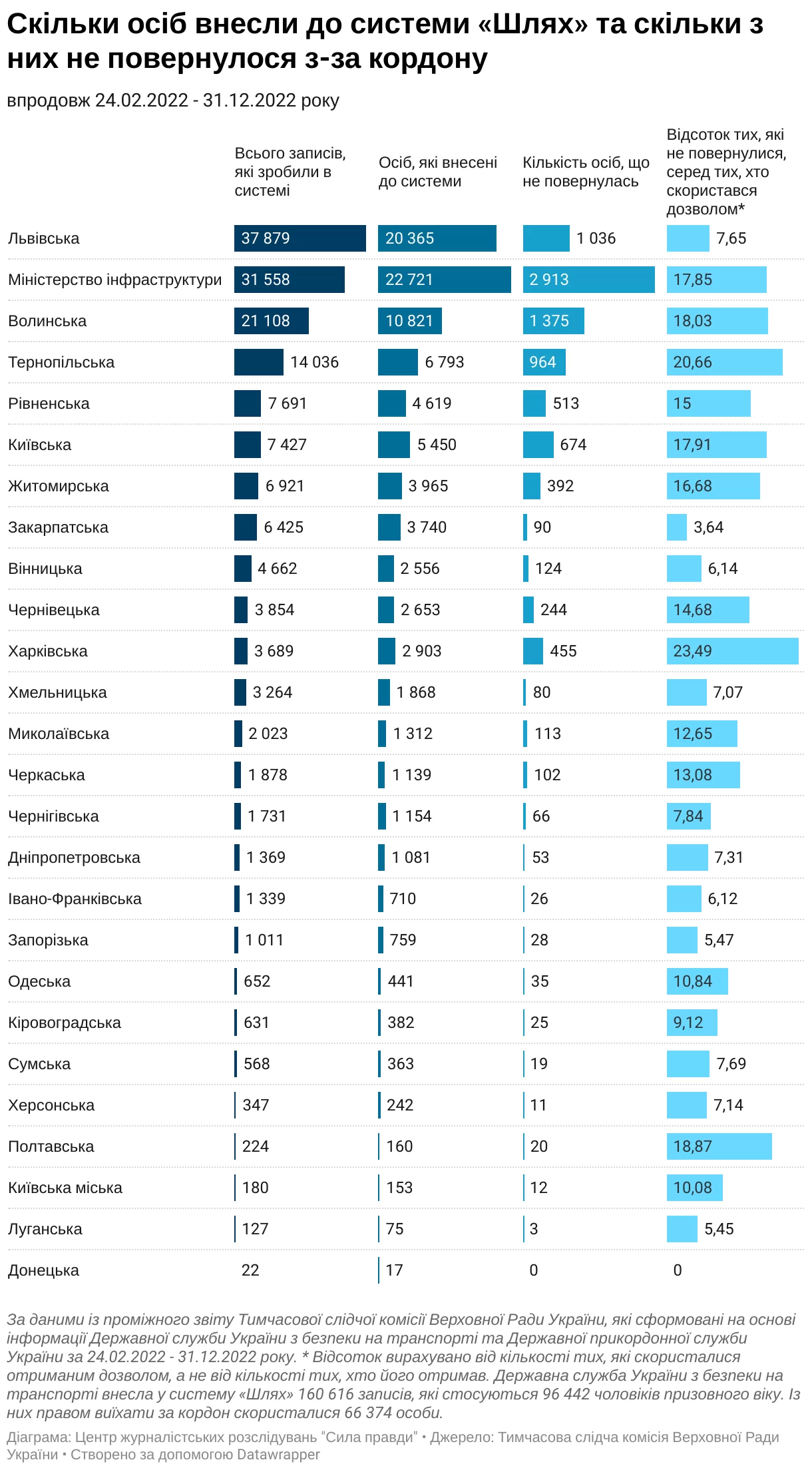 З 24 лютого і до кінця 2022 року за кордон через систему «Шлях» виїхали 7625 волинян. Отримали ж такий дозвіл 10 821 житель регіону – понад 3 тисячі військовозобов’язаних не виїжджали, попри наявність дозволу. Серед волинян не повернулися 1375 осіб, що з загальної кількості тих, хто виїхав, становить 18,03%.