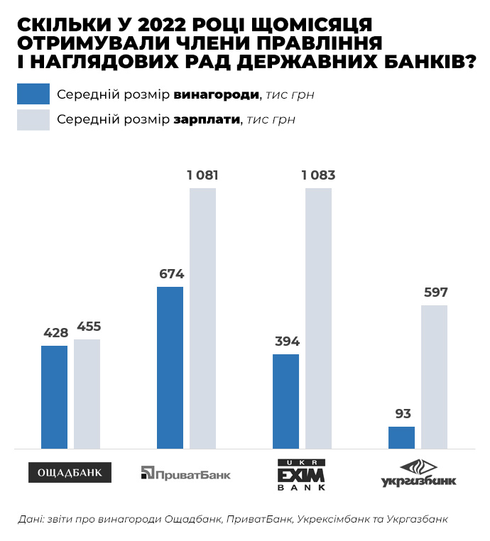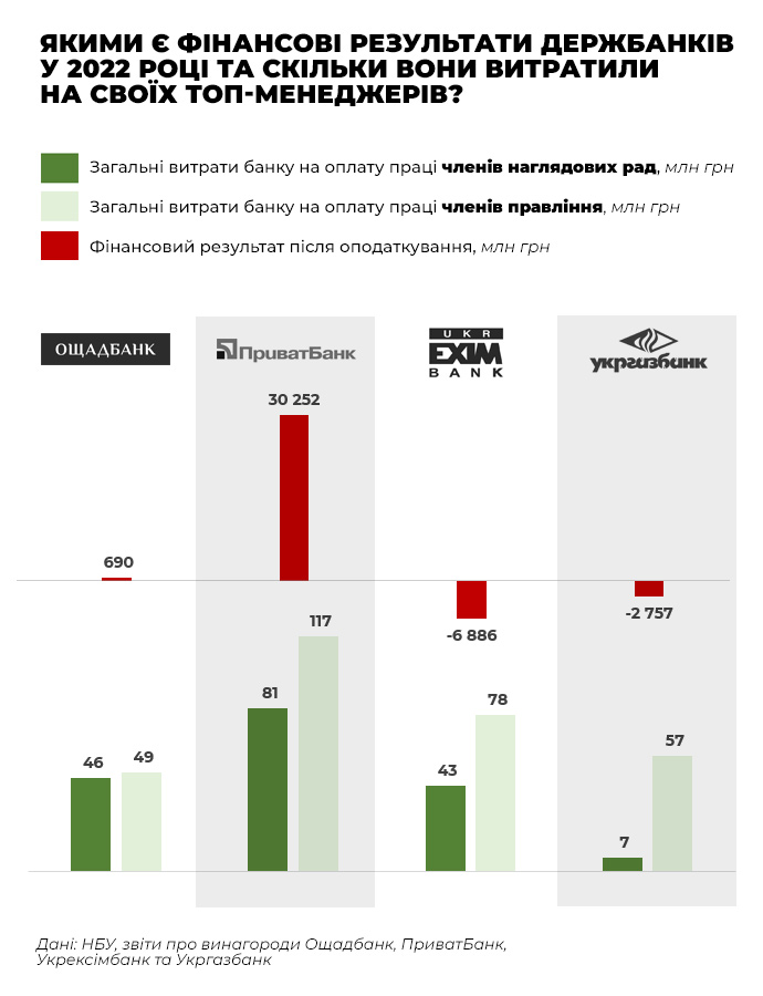 Відповідно до звітів за 2022 рік, на утримання членів правлінь та наглядових рад чотири державні банки витратили понад 477 млн грн. Стільки їхні керівники отримали після вирахування податків. Більшу частину вказаної суми, 301,1 млн грн, становили зарплати членів правлінь банків. Решту, 176,3 млн грн, отримали члени наглядових рад.