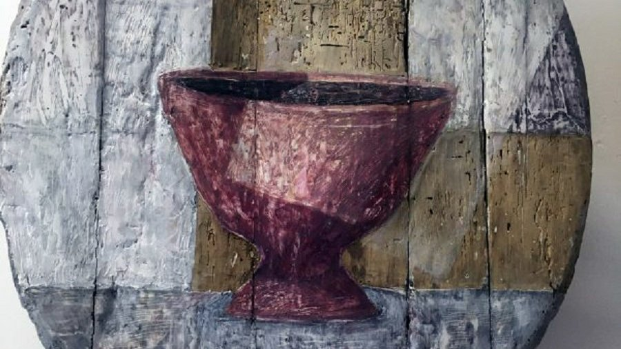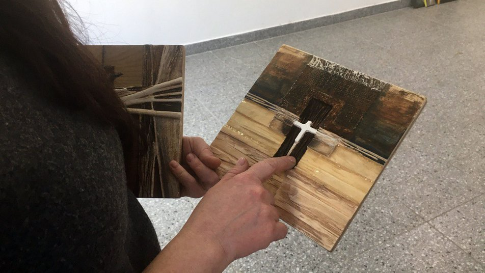 Художниця Оксана Свіжак презентує три роботи. Вони виконані на дерев’яних дошках, які колись використовувались у побуті. "На них сліди людської праці, як от, наприклад, на старій кришці від діжі, де зображена "Чаша", – розповіла художниця.