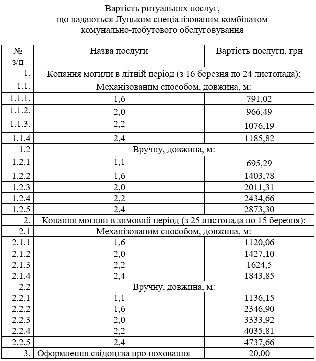 12 квітня виконком розглянув звернення Луцького спеціалізованого комбінату комунально-побутового обслуговування та врахувавши рекомендації комісії з питань ціноутворення та тарифної політики, затвердив нову вартість деяких ритуальних послуг.