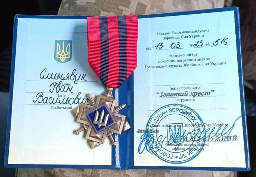 Захисник України з села Голядин Іван Слинявук отримав почесний нагрудний знак «Золотий хрест» від Головнокомандувача Збройних сил України генерала Валерія Залужного, – повідомили у Шацькій селищній раді.