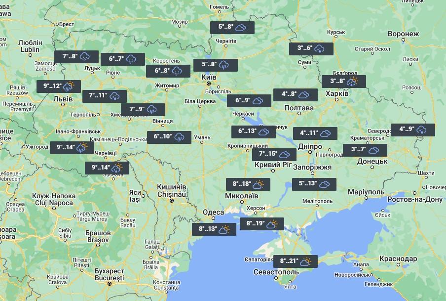 Згідно з прогнозом, в Києві в суботу буде похмуро, температура повітря вночі +5°, вдень +8°, сильний дощ. У неділю вночі очікується +7°, а вдень +14°, похмуро, суцільна хмарність.