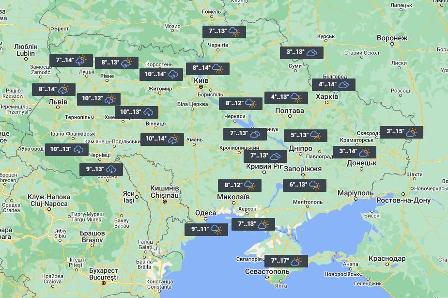 Тиждень в Україні розпочнеться з відносно теплої погоди, адже в більшості областей повітря прогріється до +13°...+15°. У Криму та на Закарпатті буде тепліше, до +17°, і лише в Одеській області очікується близько +11°. На заході України очікуються дощі, місцями - сильні.