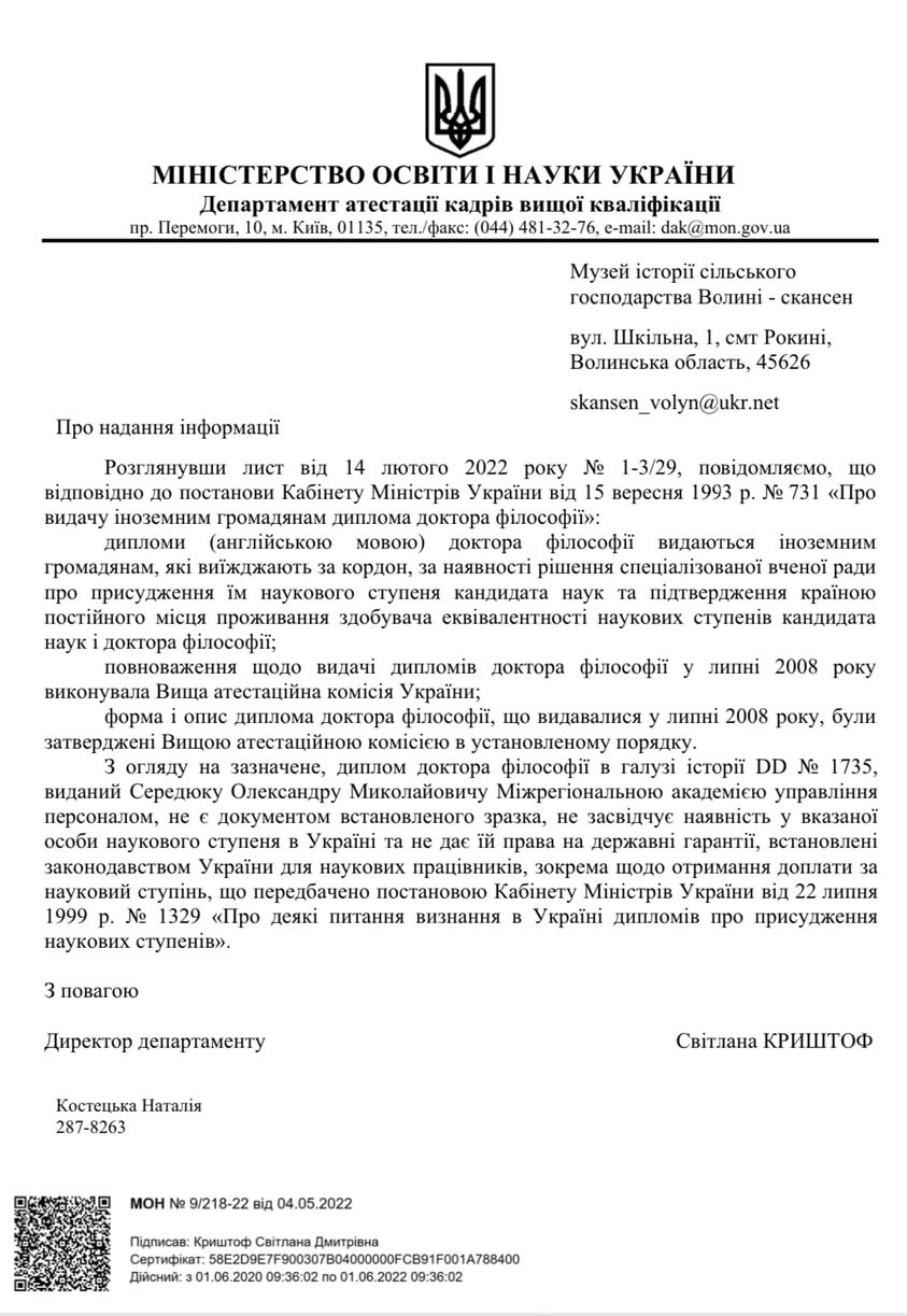 Як йдеться в офіційному листі, той «диплом» не є документом встановленого зразка, не засвідчує наявність у вказаної особи наукового ступеня в Україні та не дає їй права на державні гарантії, встановлені законодавством України для наукових працівників, зокрема щодо отримання доплати за науковий ступінь.