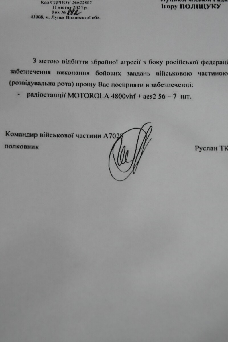 Повідомила: військовослужбовці конче потребують засобів зв'язку. Йдеться про рації, тож просить муніципалітет посприяти у їх закупці.