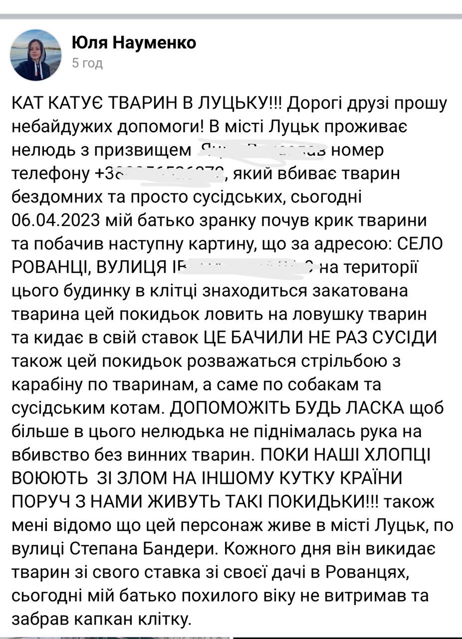 «06.04.2023 мій батько зранку почув крик тварини та побачив наступну картину, що в селі Рованці на території цього будинку в клітці знаходиться закатована тварина. Цей покидьок ловить тварин та кидає в свій ставок. Це бачили не раз сусіди, також цей покидьок розважається стрільбою з карабіну по тваринах, а саме по собаках та сусідських котах. Кожного дня він викидає тварин зі свого ставка зі своєї дачі в Рованцях, сьогодні мій батько похилого віку не витримав та забрав капкан-клітку», - написала вона.