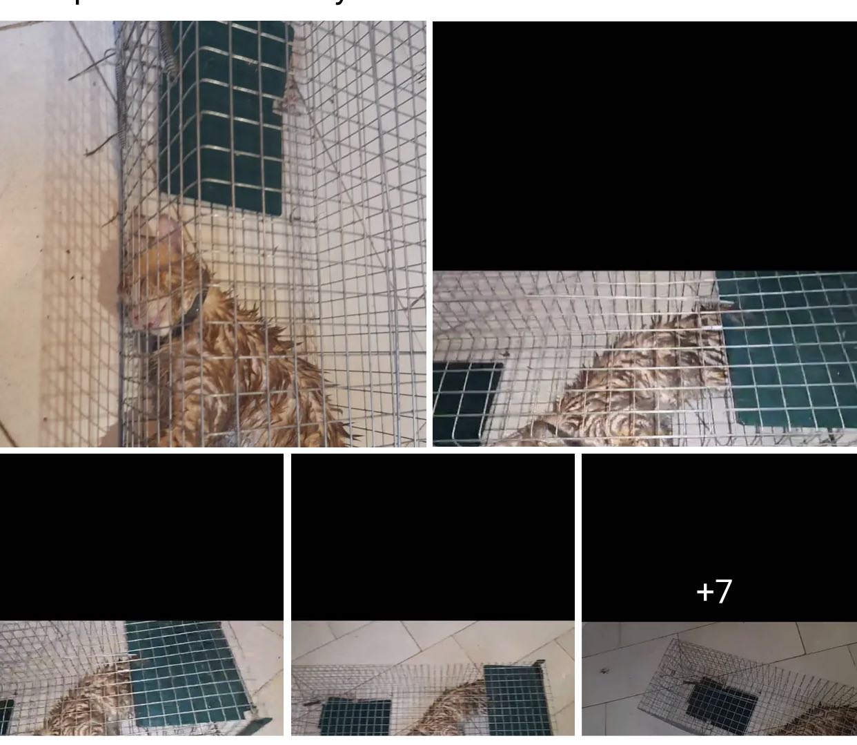 На фото і відео видно мокру тварину в клітці, яка лежить і лише жалібно нявчить.