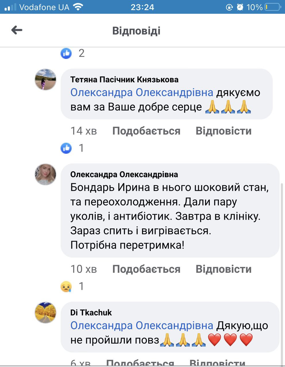 Згодом стало відомо, що того ж вечора тварину небайдужі завезли до ветеринара, у кота - шоковий стан і переохолодження, йому дали ліки й він зараз відігрівається. На вигляд котові, кажуть, роки два, він має нашийник, тож, можливо, його розшукують господарі. Нині ж йому шукають перетримку.