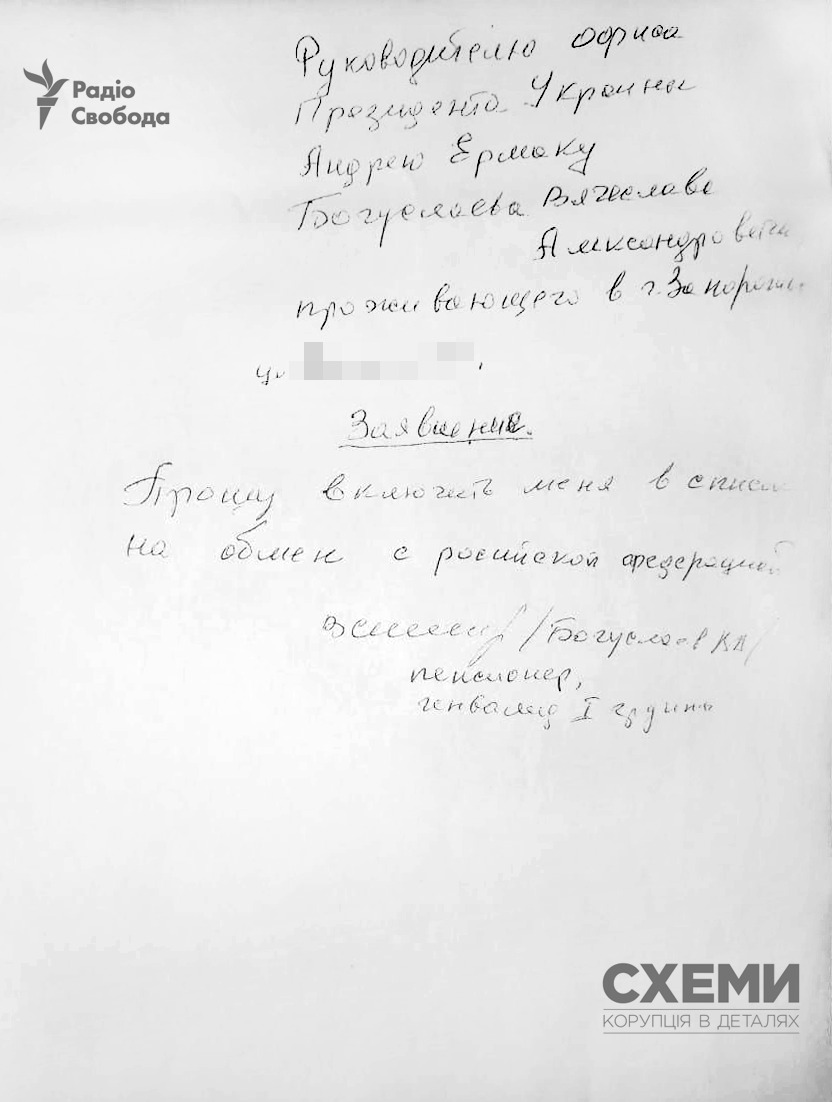 «Прошу додати мене у список на обмін з російською федерацією», – пише Богуслаєв у заяві до Офісу президента, написаній російською мовою.