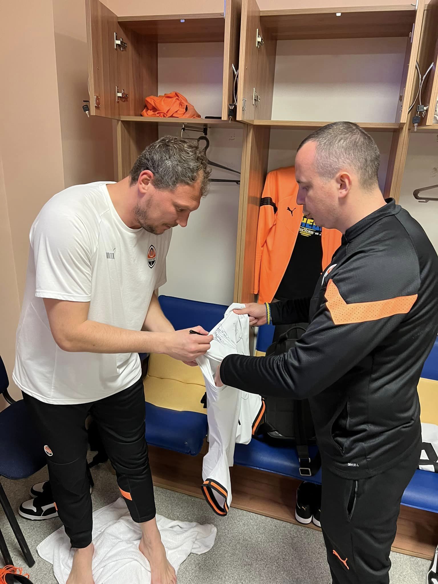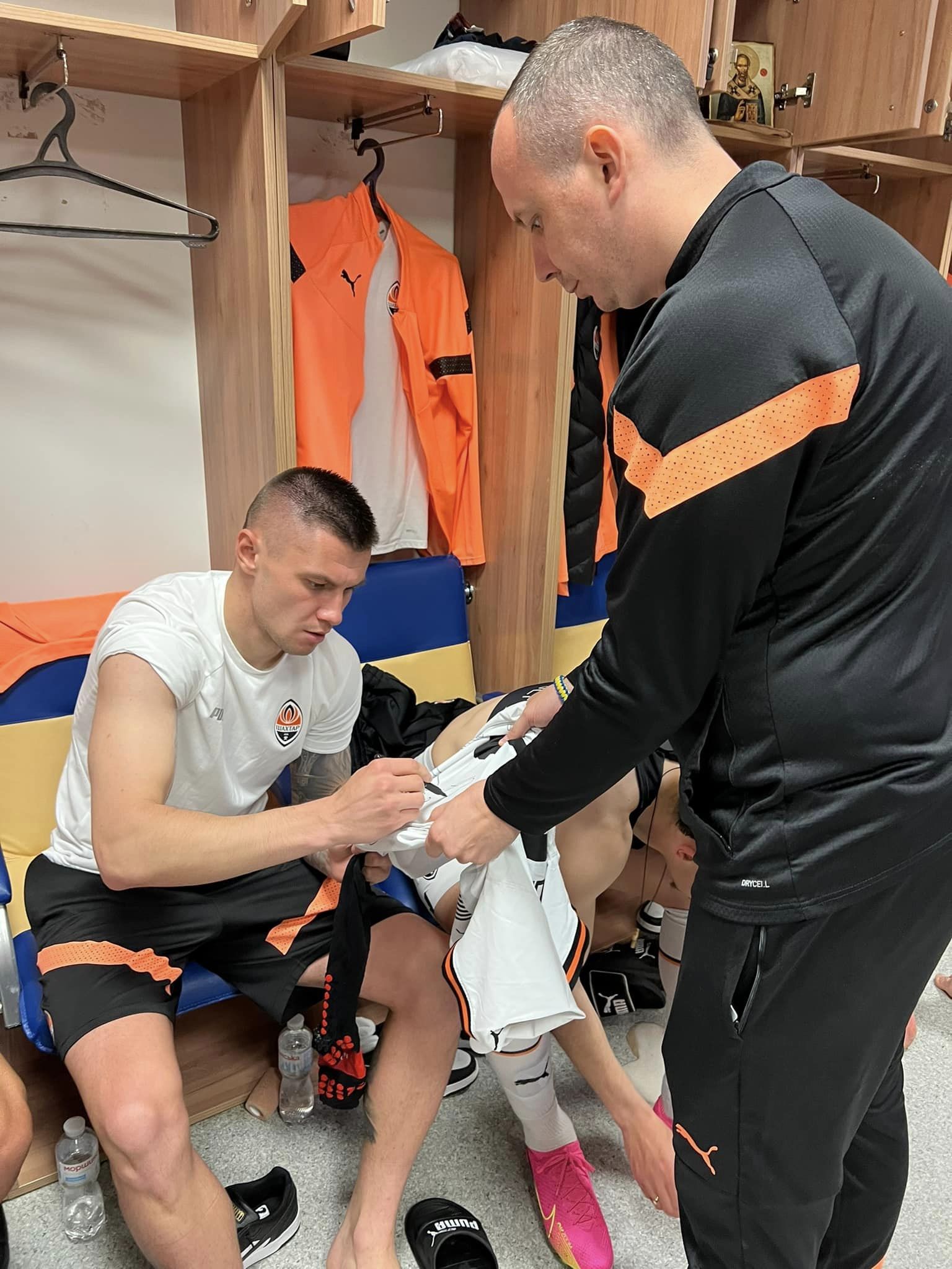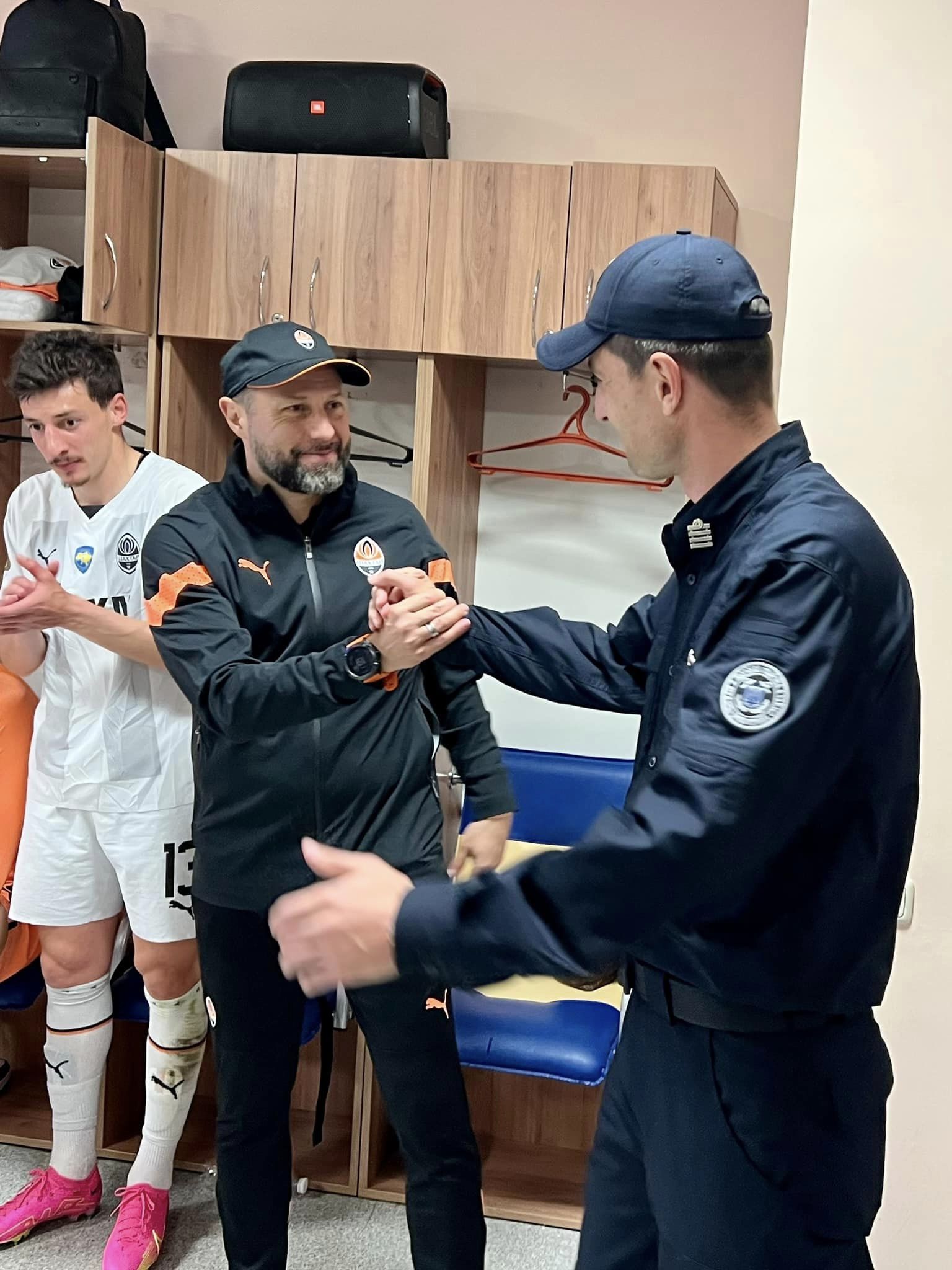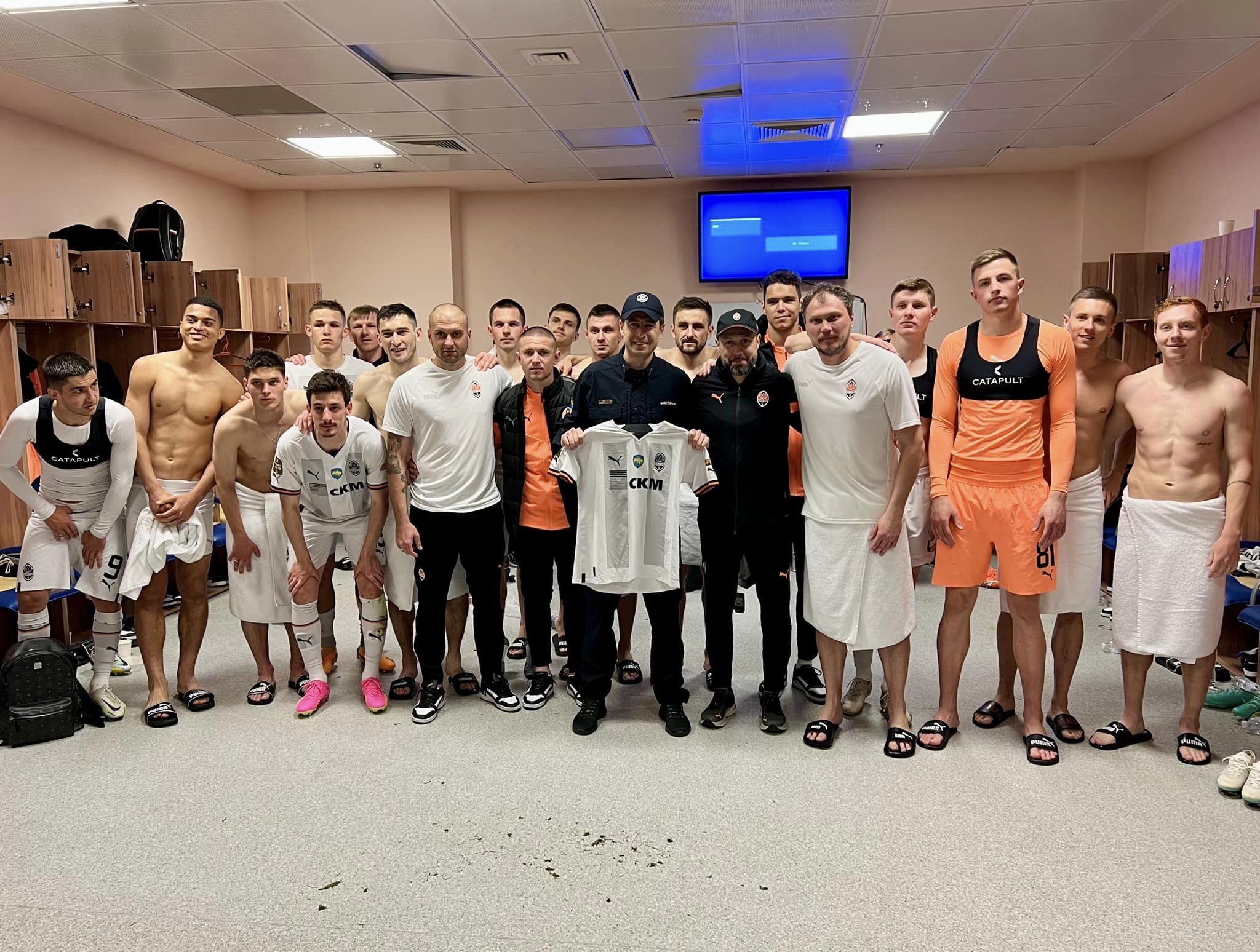 Після поєдинку Інгулець - Шахтар, який символічним ударом розпочав прикордонник Станіслав Керод, «гірники» запросили захисника Маріуполя та Азовсталі до своєї роздягальні.