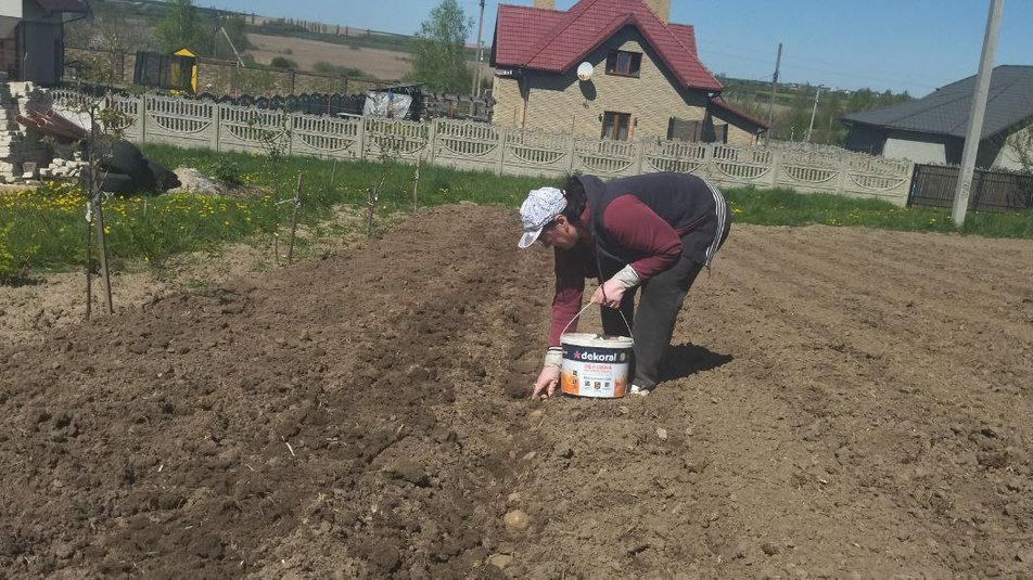 Ручним способом садить картоплю волинянка Світлана Савчук. Зі слів жінки, планує висадити сотку за день-два.