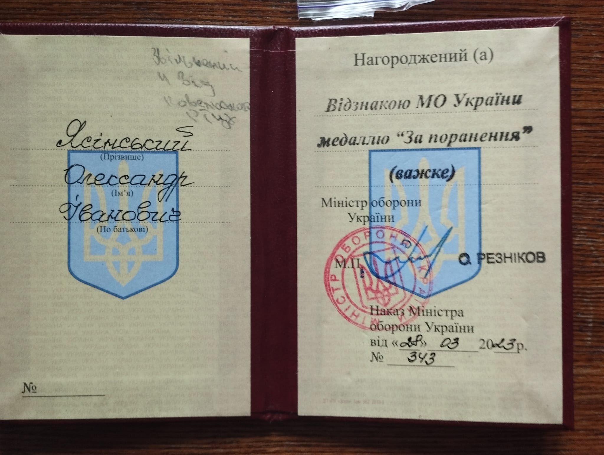 Колишнього військовослужбовця волинської бригади Олександра Ясінського нагородили відомчою відзнакою Міністерства оборони «За поранення».