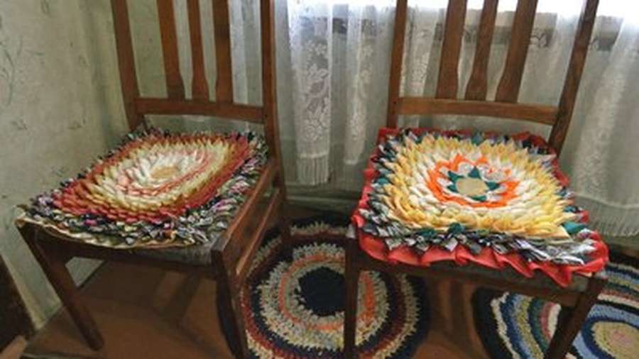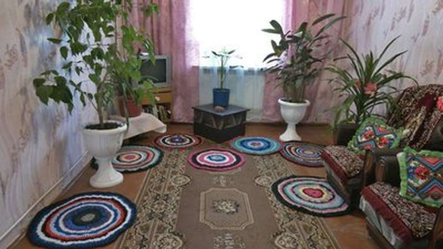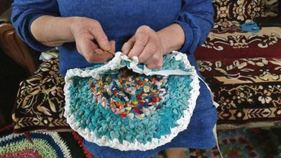 «Ріжу по кругу кофту чи там спідницю, чи штани. По кругу ріжу і така довга нитка получається. То своя, то з гонуків, то з дітей, інший раз вийду на базар, як не дуже дорого, то купляю з гуманітарки», – сказала пенсіонерка.
