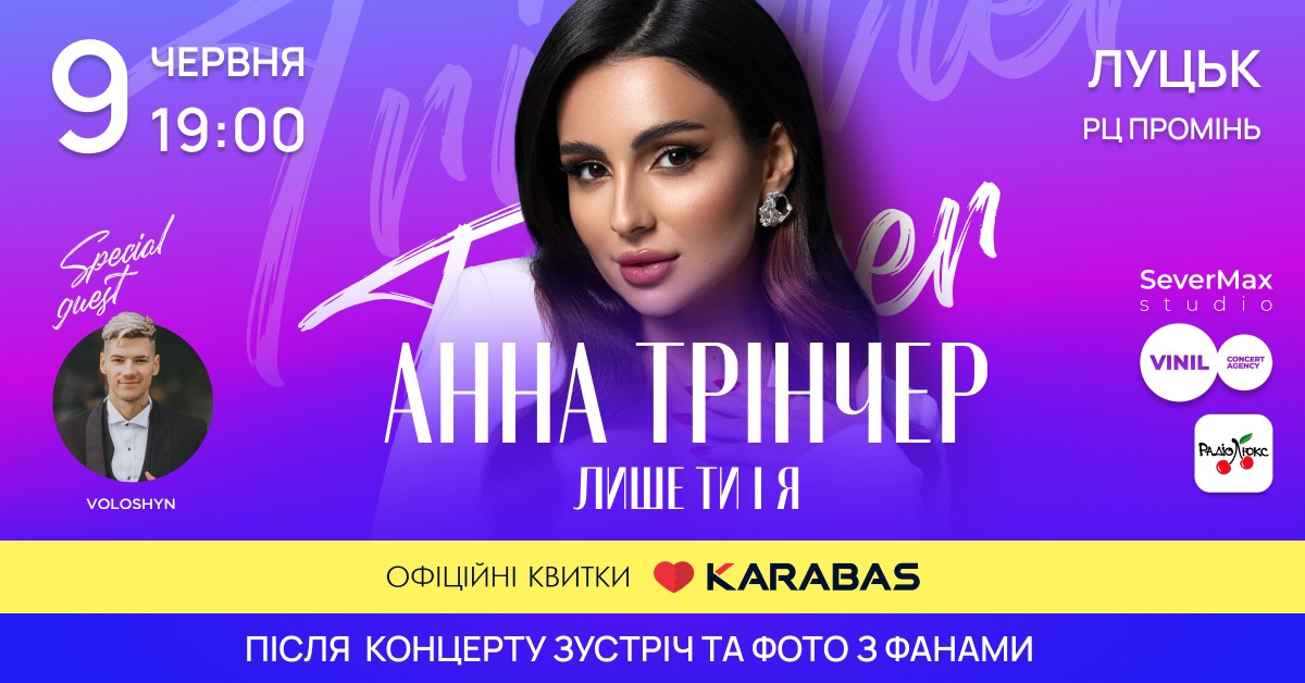 У п'ятницю, 9 червня, о 19:00 в РЦ «Промінь» у Луцьку відбудеться концерт співачки Анни Трінчер.