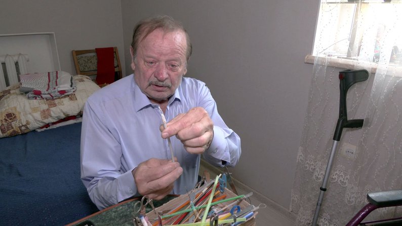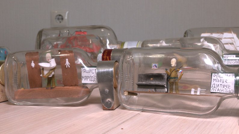70-річний волинян Володимир Ящук від початку повномасштабного вторгнення працює над колекцією мініатюр про злочини російських військових. Фігурки робить з різних матеріалів і поміщає їх у скляні пляшки.