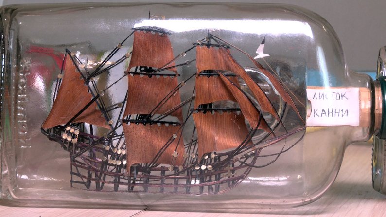 "Англійський корабель я зробив з книжки. Потім такий дивний матеріал як павутина, я зробив такий каркас, вкрав в павука павутину і заніс його в пляшечку. З ребер карася я зробив вітрила, з різноманітних шкірок, листочків", – розповів майстер.