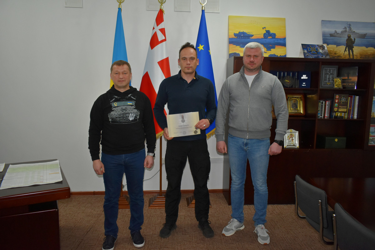 Волонтерам з Латвійської Республіки сьогодні, 3 травня, перший заступник голови облдержадміністрації Сергій Мовенко вручив відзнаки Президента України "За оборону України" та дипломи до них за волонтерську діяльність, активне сприяння виконання завдань, пов’язаних із забезпеченням здійснення заходів із забезпечення оборони України, захисту інтересів у зв’язку з широкомасштабною збройною агресією російської федерації.