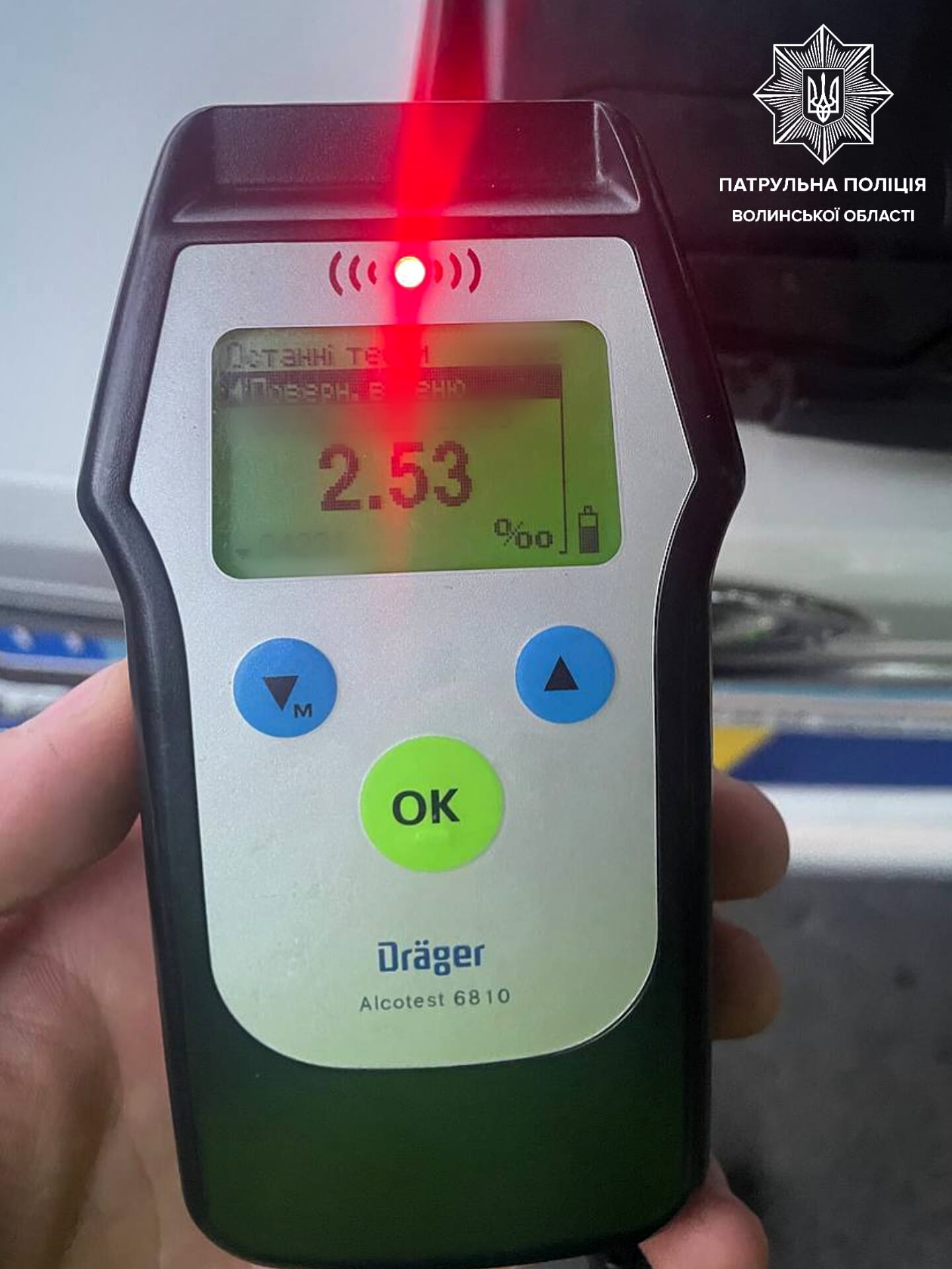 Коли патрульні прибули на місце події, то виявили, що керманич має ознаки алкогольного сп’яніння. Це підтвердив і прилад Drager, який показав, що у видихуваному повітрі чоловіка міститься 2,53% проміле алкоголю.