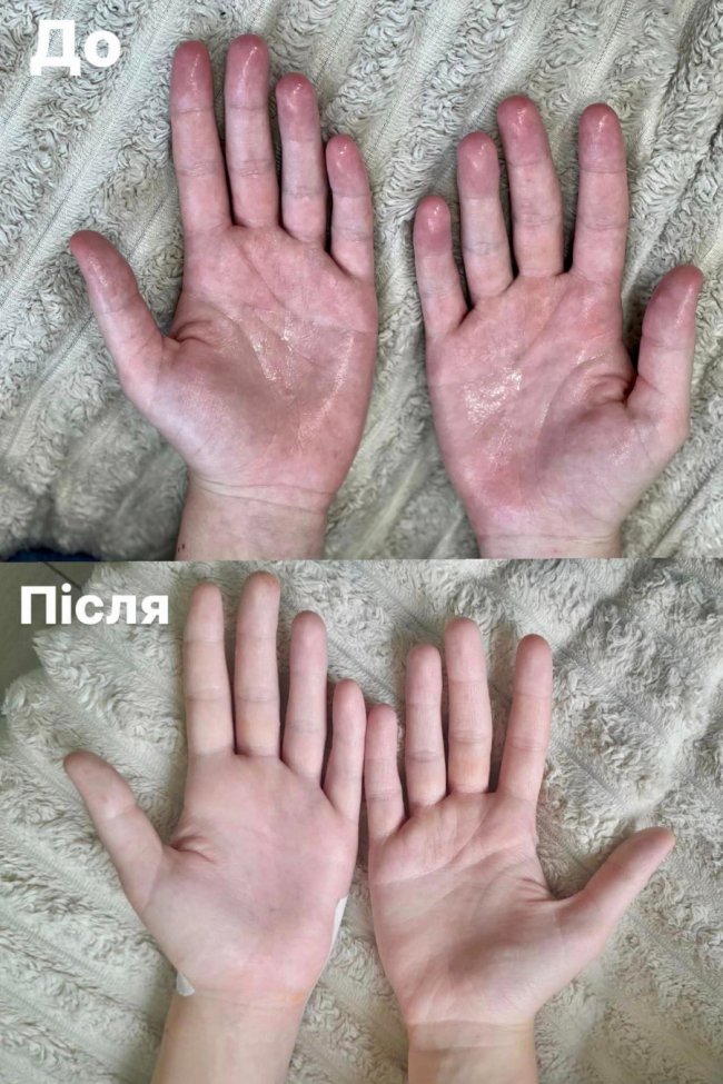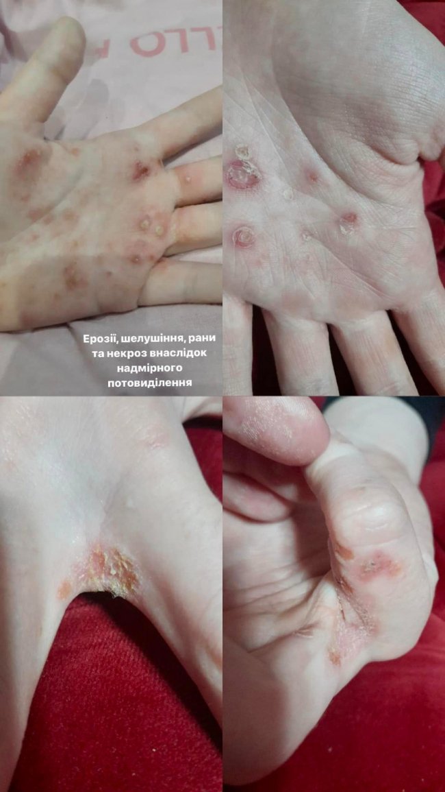 “У Олександри через надмірне потовиділення на руках і ногах були ерозії, некрози шкіри, шелушіння та глибокі тріщини. Такий випадок, щоб внаслідок гіпергідрозу був некроз досить рідко трапляється і ця пацієнтка саме така. Рідко таке буває”, - розповів дитячий хірург Микола Микита.