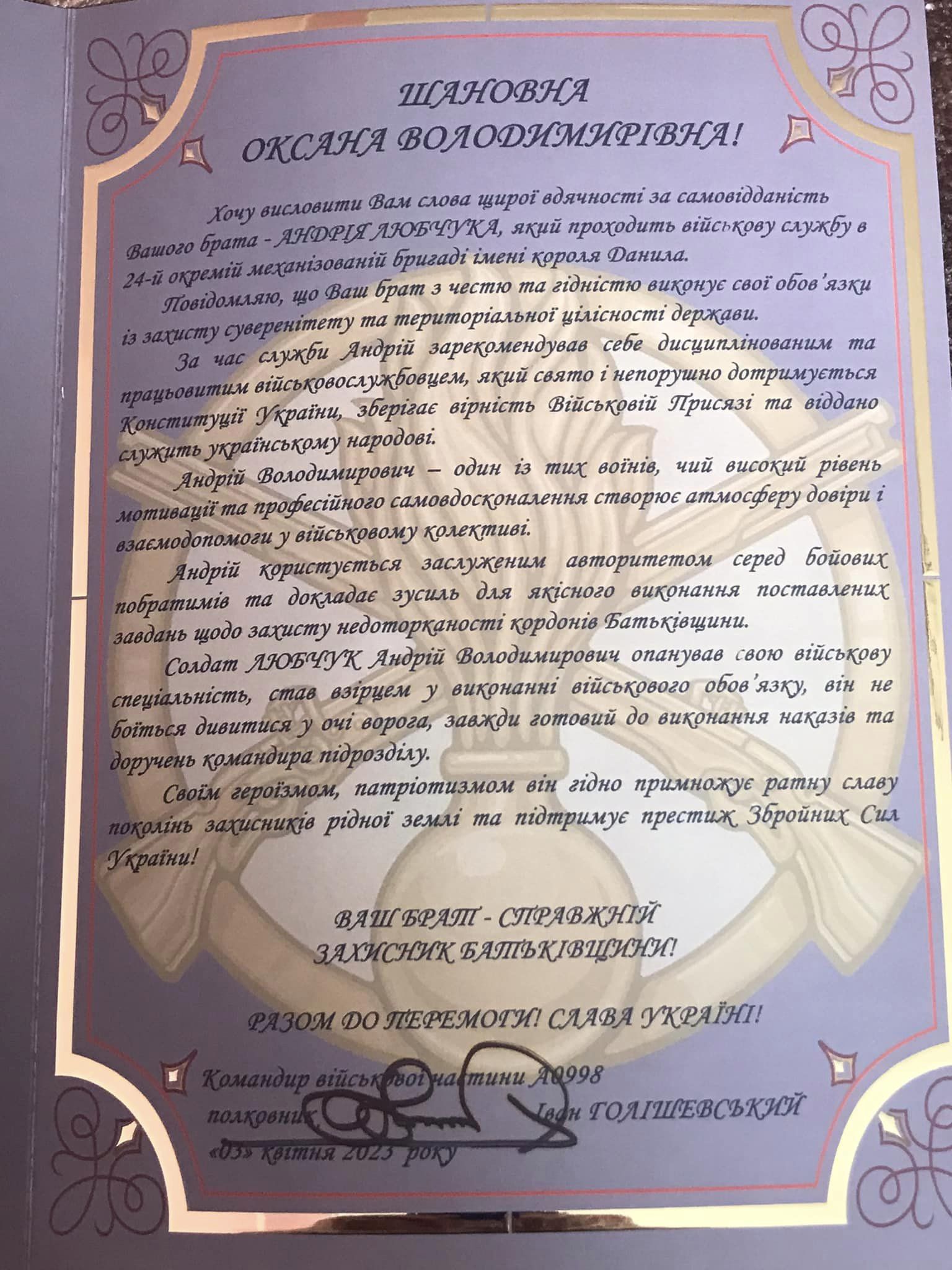 «Солдат Андрій Любчук – один із тих воїнів, чий високий рівень мотивації та професійного самовдосконалення створює атмосферу довіри і взаємодопомоги у військовому колективі. Він користується заслуженим авторитетом серед бойових побратимів та докладає зусиль для якісного виконання поставлених завдань щодо захисту недоторканності кордонів Батьківщини. Досконало опанував свою військову спеціальність, став взірцем у виконанні військового обов’язку, він не боїться дивитися в очі ворога, завжди готовий до виконання наказів та доручень командира підрозділу. Своїм героїзмом, патріотизмом гідно примножує ратну славу поколінь захисників рідної землі та підтримує престиж Збройних сил України. За час служби Андрій зарекомендував себе дисциплінованим та працьовитим військовослужбовцем, який свято і непорушно дотримується Конституції України, зберігає вірність Військовій Присязі та віддано служить українському народові», – саме так свого підлеглого, уродженця нашого поліського села Качин, характеризує в листі-подяці рідним командир військової частини А0998 полковник Іван Голішевський.