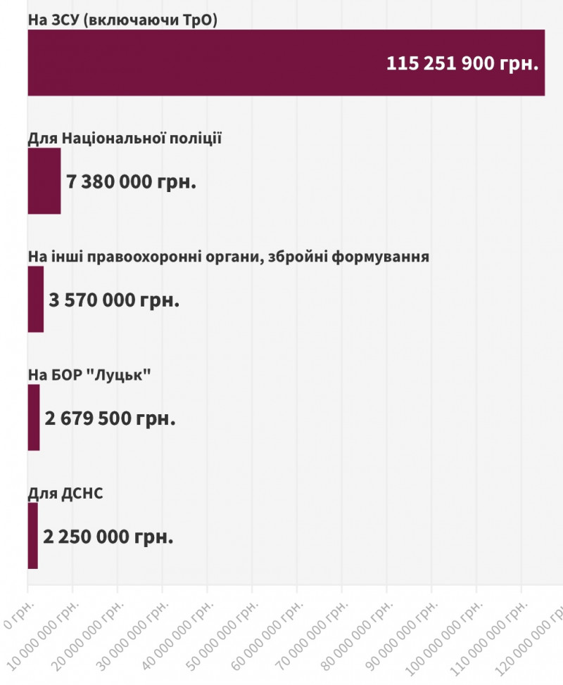 115,3 мільйона гривень спрямували на підтримку ЗСУ, включаючи територіальну оборону. Ще 2,7 мільйона виділяли на підтримку батальйону оперативного реагування «Луцьк».