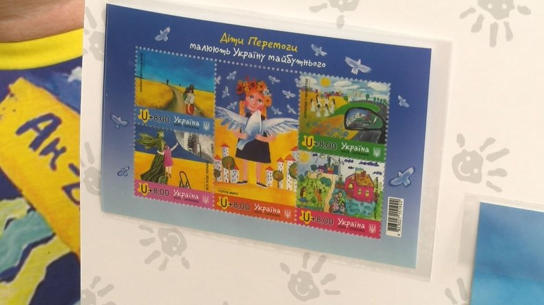 На блоках марок зображено п'ять найкращих робіт діток з усієї України, як вони бачать Україну, яка перемагає.