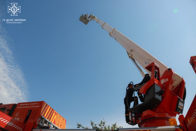 У Луцьку рятувальники провели навчання з роботи на новітньому колінчастому підйомнику АКП-45, отриманому за сприяння німецької гуманітарної місії.