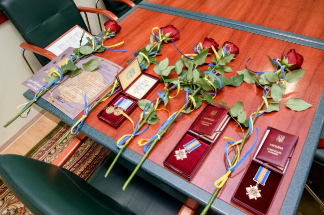 Ордени і медалі, присвоєні посмертно, вручили родичам загиблих захисників України – їхнім батькам, дружинам і дітям.