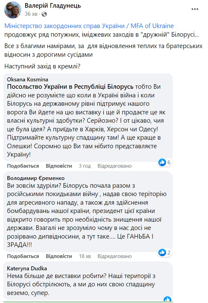 Така ініціатива українського посольства викликало обурення в мережі, адже з території білорусі неодноразово здійснювалися обстріли України, а білоруський диктатор олександр лукашенко є одним із відданих посіпак володимира путіна. У коментарях до допису українці поцікавилися, чи варто посольству України взагалі продовжувати свою діяльність у Білорусі.