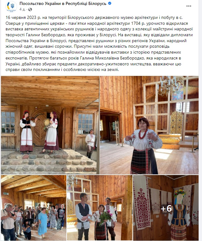 На сторінці посольства зазначено, що 16 червня дипломати відвідали територію білоруського державного музею архітектури та завітали на виставку майстрині народної творчості Галини Безбородко, яка народилася в Україні, але проживає у білорусі.
