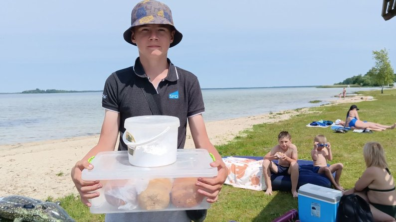 На березі Світязя можна побачити уже понад два десятки відпочивальників, – розповідає 14-тирічний Максим. Хлопець пропонує туристам пампухи, які пече його тітка. Каже: відпочивають переважно мами з дітьми.