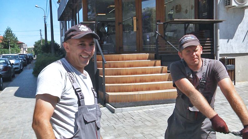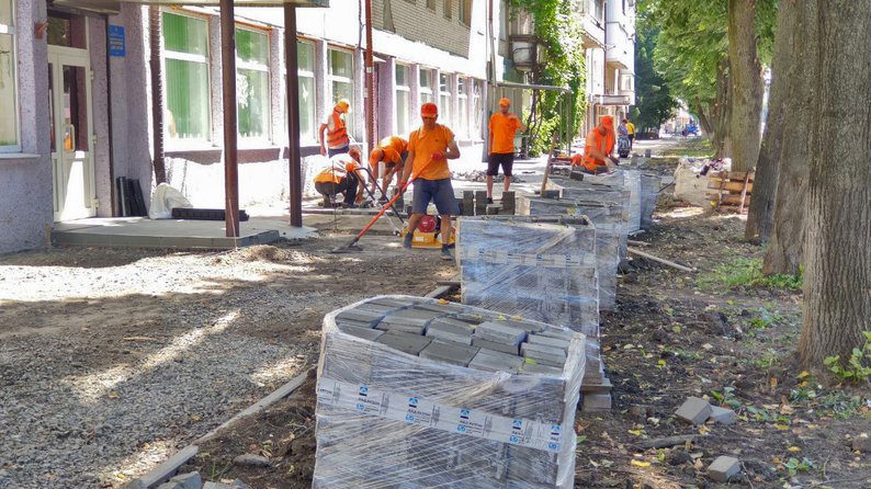 На непарній стороні проспекту бригада робітників вкладає тротуарну плитку на тротуарі.