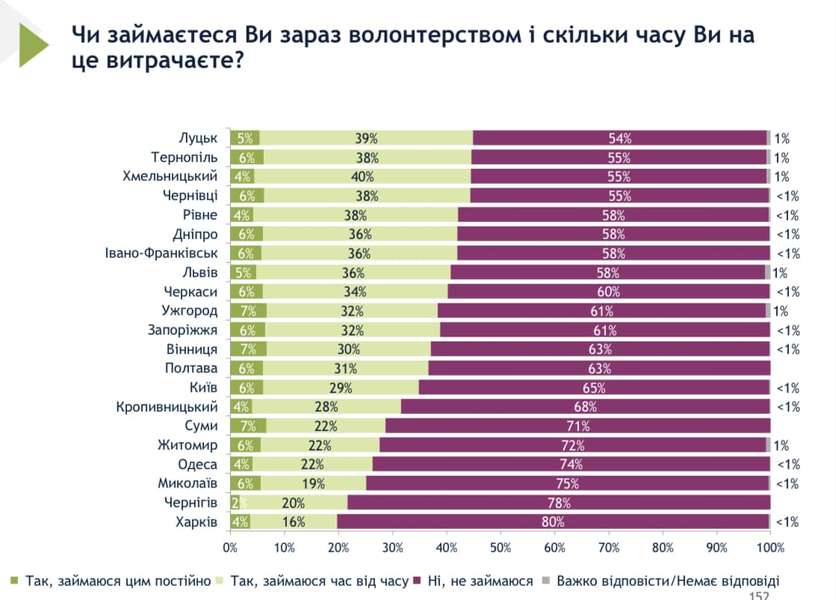Відповідно до результатів, 44% лучан волонтерять. На другому місці – Тернопіль, а третє – у Хмельницького.