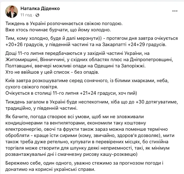 Про це повідомила народна синоптикиня Наталка Діденко на своїй сторінці у Facebook.