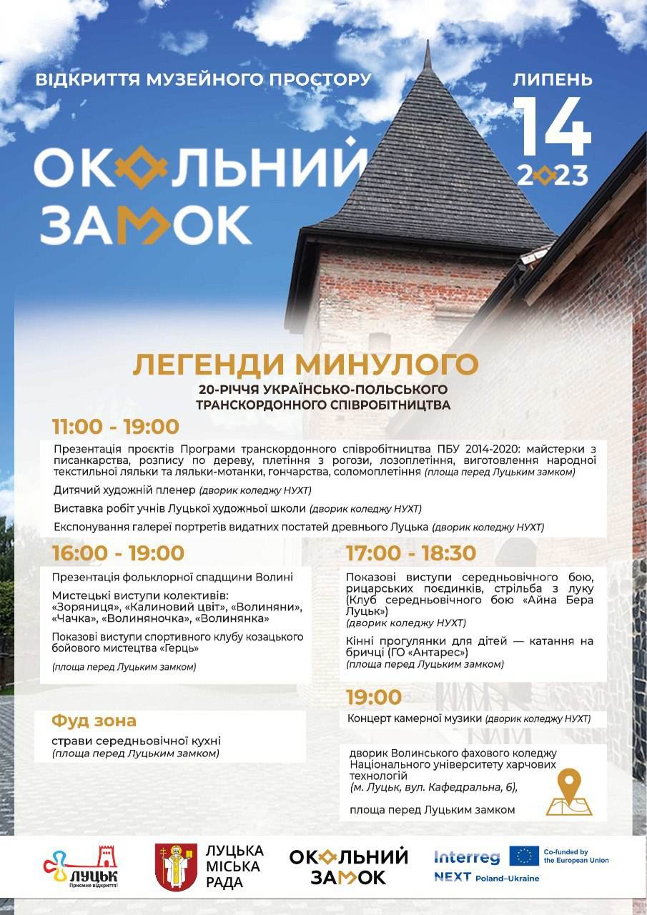 Зокрема, на площі перед Луцьким замком з 11.00 до 19.00 можна буде ознайомитись із проєктами транскордонного співробітництва ПБУ 2014 — 2020, які реалізовувались українськими містами з європейськими партнерами, а ще відбуватимуться виступи фольклорних колективів, майстерки з народних ремесел, кінні прогулянки та діятиме фудзона.