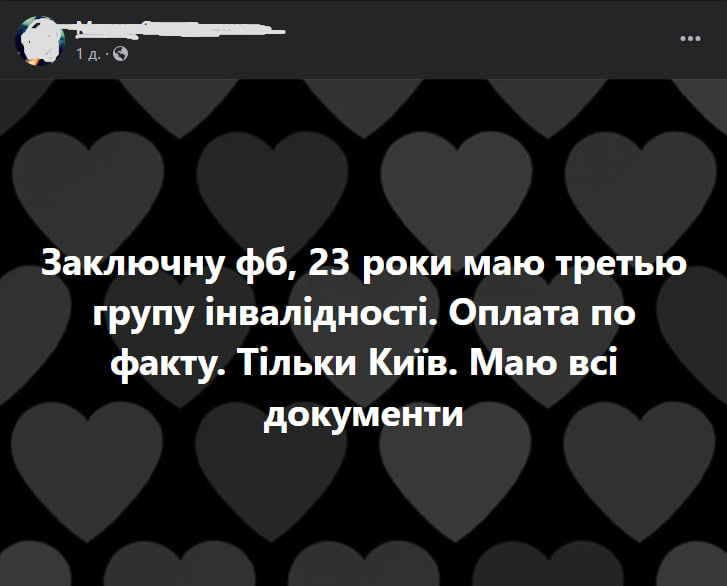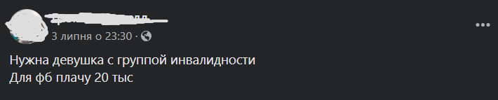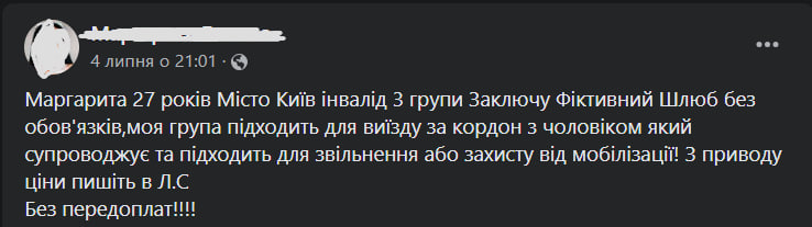 В соцмережах за укладання фіктивного шлюбу між військовозобов’язаним та жінкою, яка має інвалідність, пропонується від 8 тис. грн до 20 тис. грн.