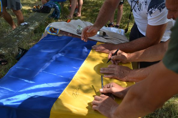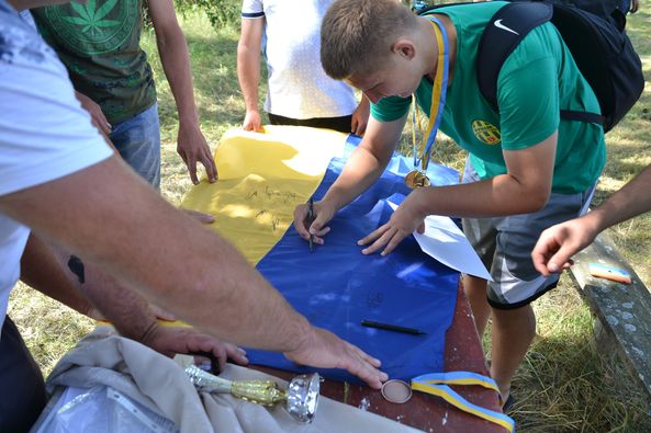 Після турніру учасники підписались на прапорі України та передали його батькам загиблого воїна.